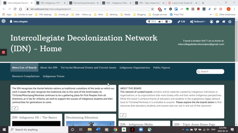 This network of curated boards contains online materials created by Indigenous individuals or organizations, or by organizations that work closely with and that centre Indigenous perspectives. While this board is aimed primarily at educators and students in the anglophone Cégep network local to Tio'tia:ke/Montreal, it is available to anyone!